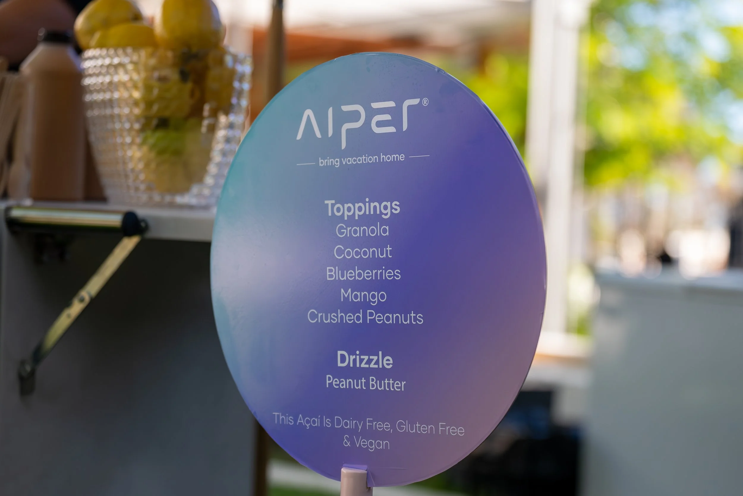 We can. We offer custom-printed bowls and even edible logo discs placed on top of each acai bowl. Menus and cart signage are also available — and can be designed to match your brand, theme, or event look.