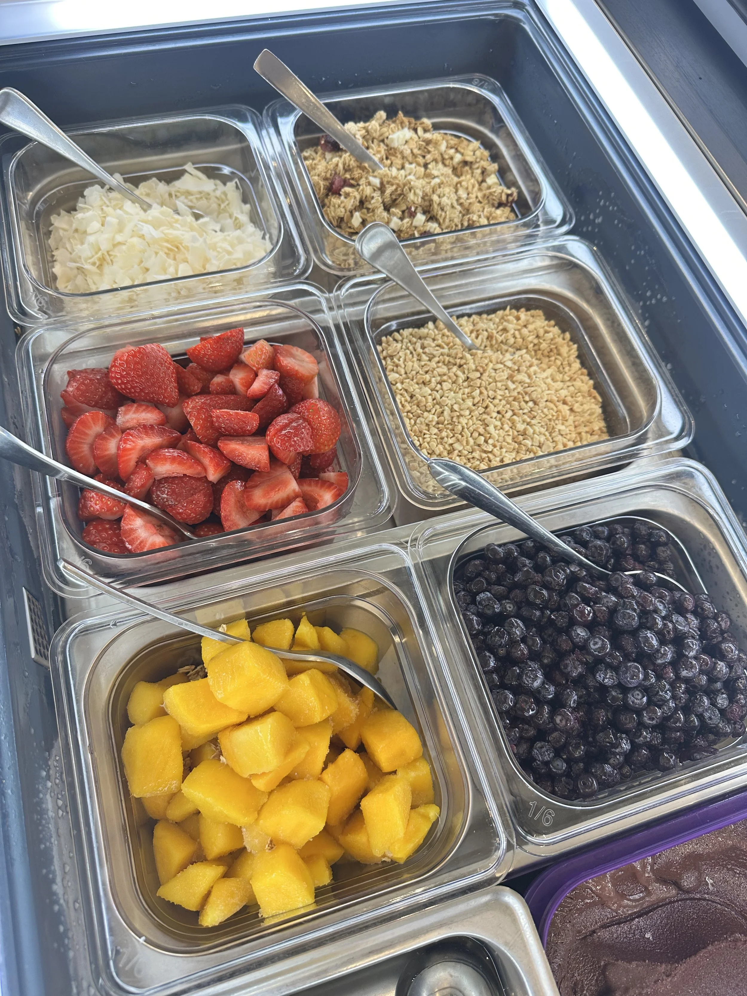 We scoop a frozen açaí base in front of guests, then let them walk the line — picking their toppings, building their bowl, and claiming their combo
